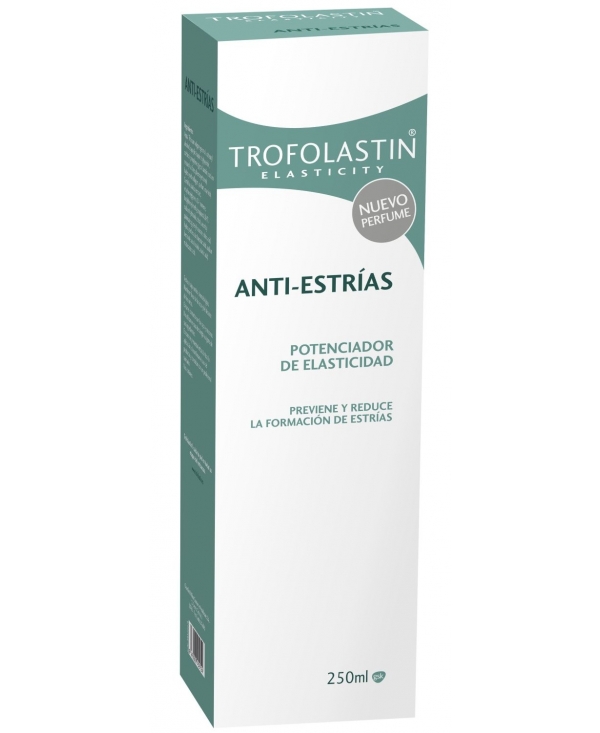 Trofolastín® antiestrías 250ml es una crema antiestrías que ayuda a prevenir su aparición. Su fórmula contiene extracto de centella asiática, que repara la piel y la reafirma; hidrolizado de colágeno e hidrolizado de elastina, que otorgan elasticidad a la piel y contribuyen a su relleno; y aceite de semilla de trigo, que actúa como un emoliente y regenerador cutáneo ante las estrías, además de ser un potente antioxidante.