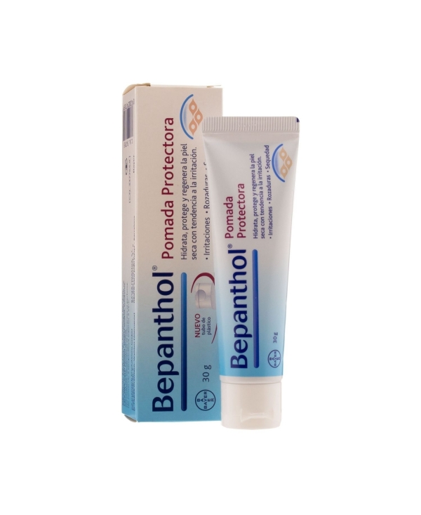 Bepanthol® Pomada Protectora 30g es una emulsión oleosa hidratante y protectora, que favorece la regeneración natural de la piel seca, sensible y fácilmente irritable. Su fórmula tiene un alto contenido lipídico y en dexapantenol, que forma una capa protectora sobre la superficie de la piel, que la aísla de los agentes externos que la irritan. Además, actúan de barrera evitando la pérdida de agua y proporcionando una elevada hidratación.